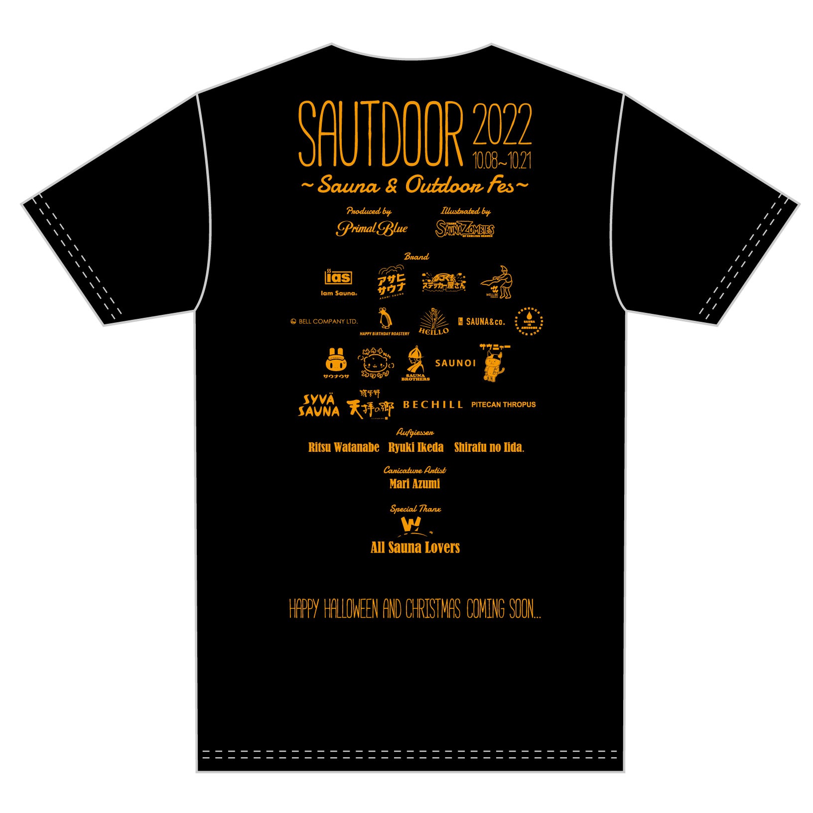 表面にはサウナゾンビーズ×PrimalBlue×渡邊りつのイラスト、背面には参加ブランドのロゴ入りフェス風Tシャツです。
