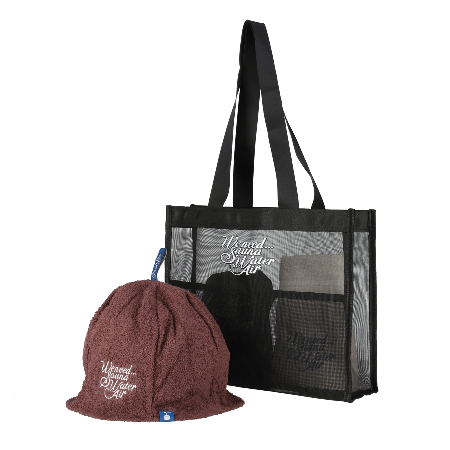 PrimalBlue サウナセット サウナハット サウナマット フェイスタオル メッシュトートバッグ sauna サウナー ジム 持ち運びに便利 入門セット キャンプ 初心者セット (パイル生地 ブラウン)