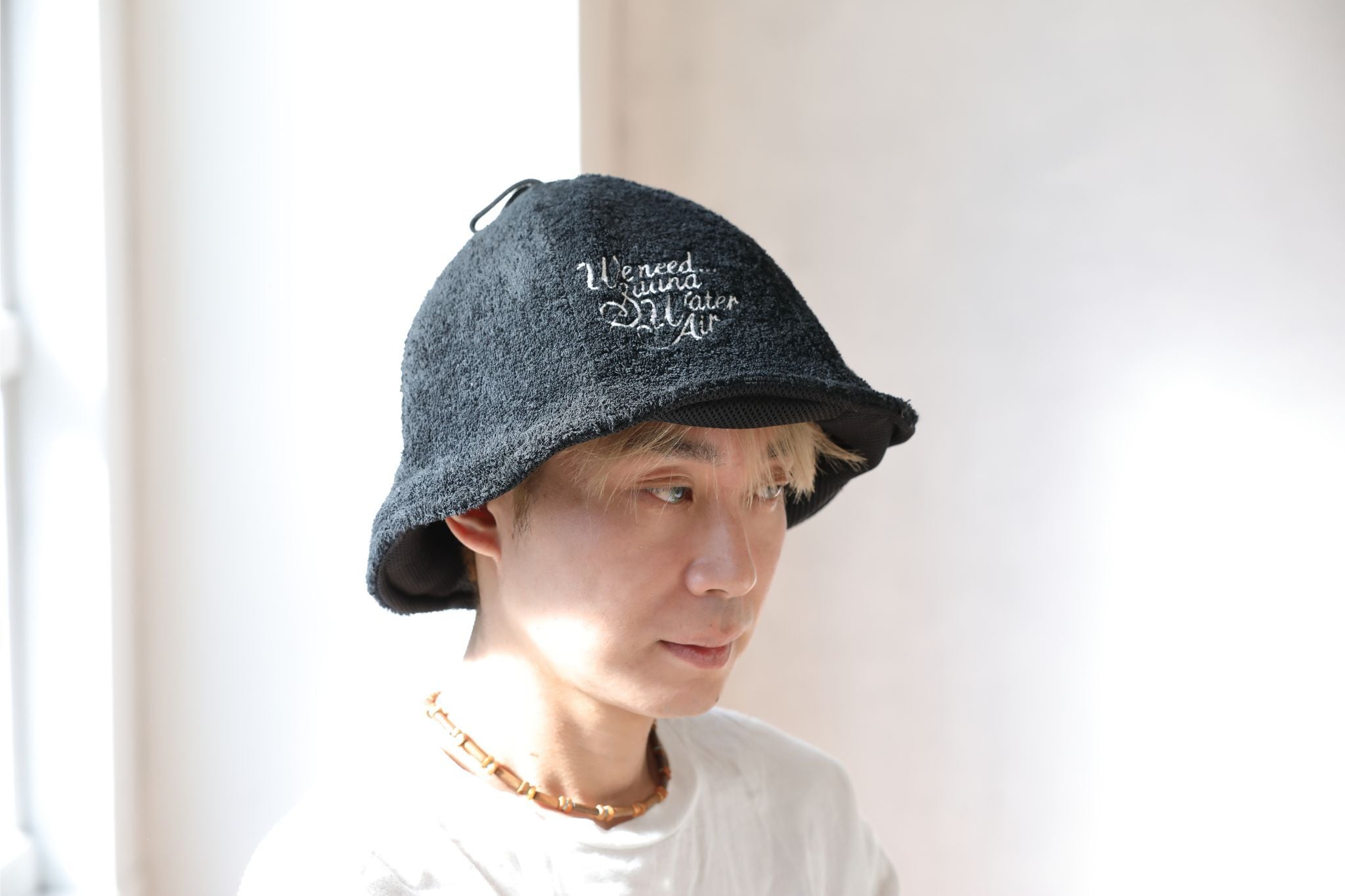 ラウンド(湾曲)した帽子のフチのデザインが特徴的。大阪泉州タオル認定ロゴのタグがアクセント。トップにはリング状の紐が付いておりフックにかけられます。室内サウナはもちろん、キャンプサウナでも活躍してくれる1枚。